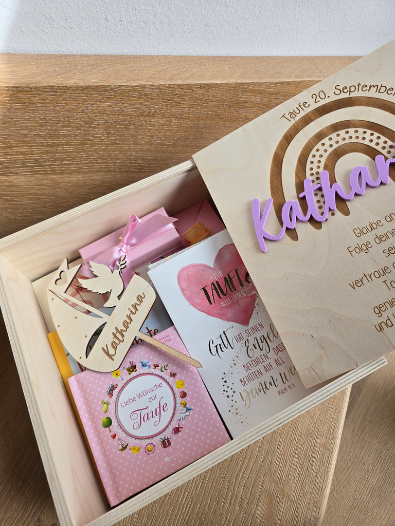 This personalized box offers enough space for valuable keepsakes and is the perfect gift for a birth, birthday or godchild.